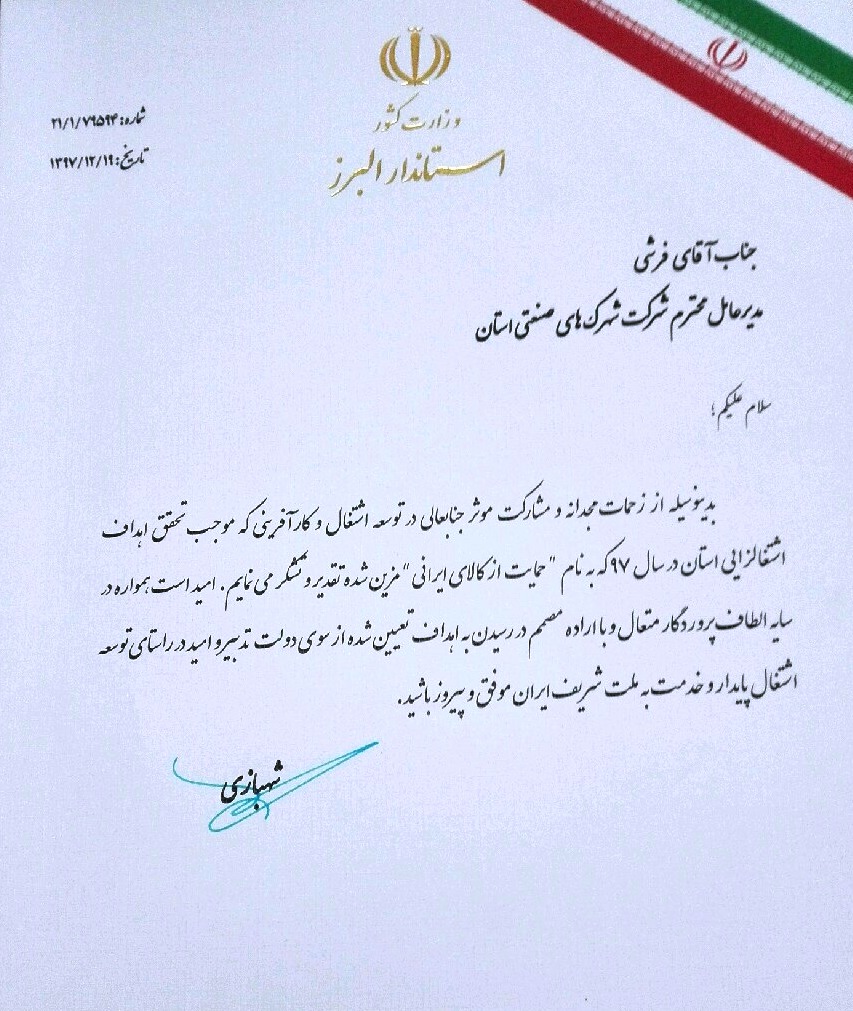 بدينوسيله از زحمات مجدانه و مشاركت موثر جنابعالي درتوسعه اشتغال و كارآفريني كه موجب تحقق اهداف اشتغالزايي استان در سال 97 كه به نام« حمايت از كالاي ايراني» مزين شده تقدير و تشكر مي نمايم.اميد است همواره در سايه الطاف پروردگار متعال و با اراده مصمم در رسيدن به اهداف تعيين شده از سوي دولت تدبير و اميد در راستاي توسعه اشتغال پايدار و خدمت به ملت شريف ايران موفق و پيروز باشيد.