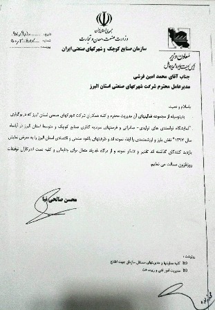 تقدير معاون وزير صنعت و رئيس سازمان صنايع كوچك و شهرك هاي صنعتي ايران از مدير عامل شركت شهرك هاي صنعتي استان البرز