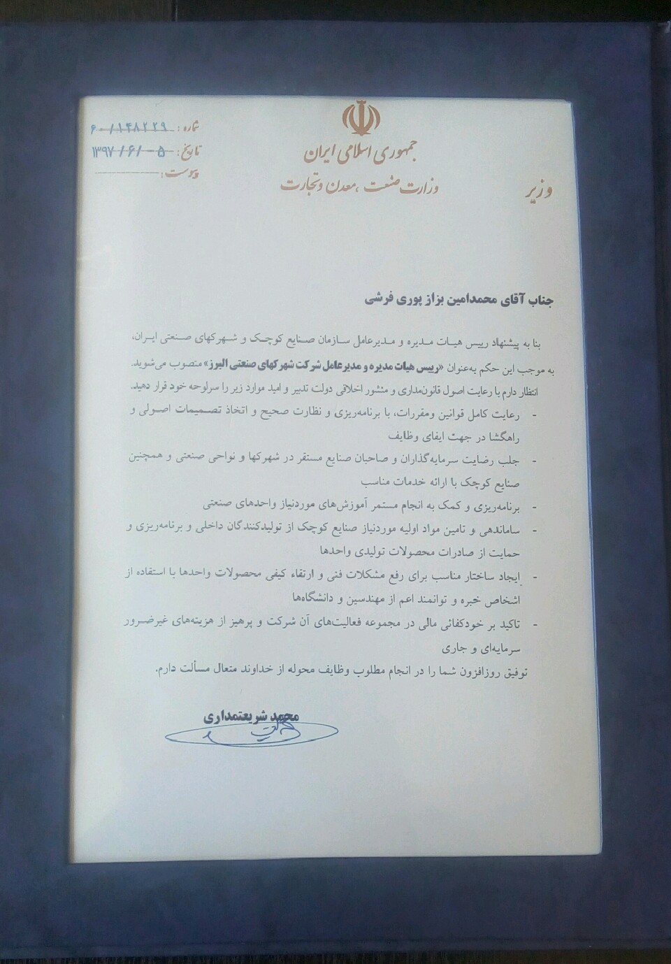 به پيشنهاد رئيس هيات مديره و مديرعامل  سازمان صنايع كوچك و شهرك هاي صنعتي كشور و به موجب اين حكم جنابعالي به عنوان رئيس هيئت مديره و مديرعامل شركت شهرك هاي صنعتي استان البرز منصوب مي شويد. اميد است  در راستاي جلب رضايت سرمايه گذاران و صاحبان صنايع مستقر در شهرك ها  و نواحي صنعتي و برنامه ريزي و كمك به برنامه ريزي و آموزش مستمر مورد نياز واحدهاي صنعتي،ساماندهي و تامين مواد اوليه مورد نياز صنايع كوچك و تاكيد بر ارتقاي كيفيت و  خودكفايي مالي واحدهاي صنعتي موفق و كوشا باشيد.